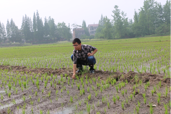 (周波在自己的雙季稻種植基地查看早稻秧苗長勢)