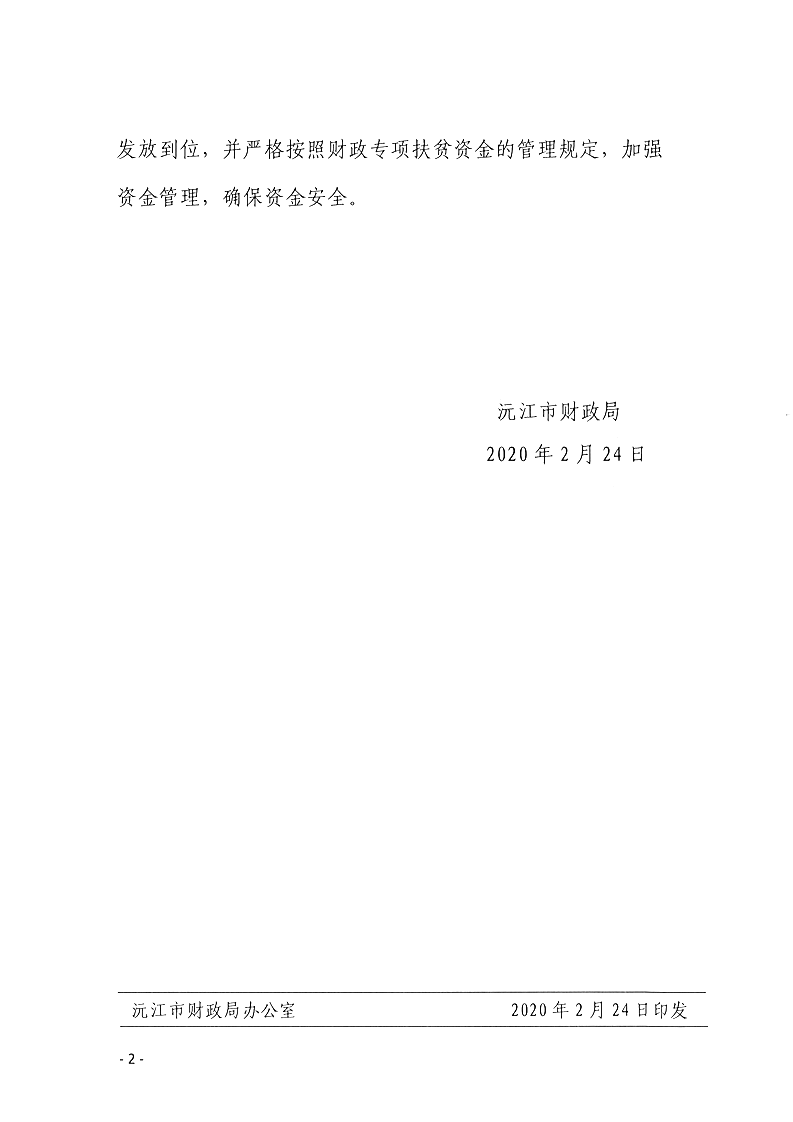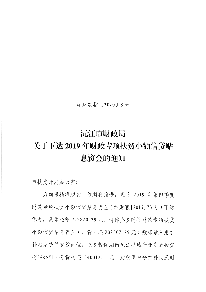 沅江市財政局關于下達2019年財政專項扶貧小額信貸貼息資金的通知 沅財農指[2020]8號