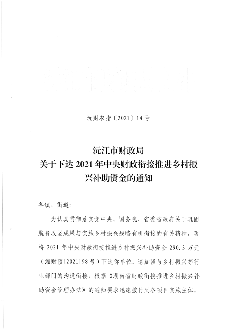 沅財(cái)農(nóng)指【2021】14號 沅江市財(cái)政局關(guān)于下達(dá)2021年中央財(cái)政銜接推進(jìn)鄉(xiāng)村振興補(bǔ)助資金的通知