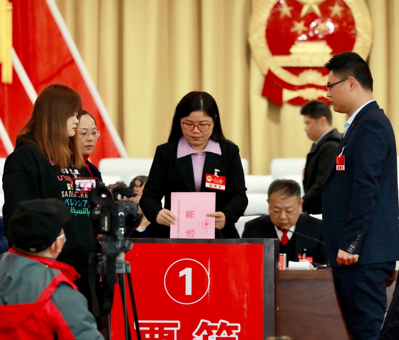 與會人大代表肩負(fù)歷史使命,在悠揚的音樂聲中,投下了自己神圣的一票。