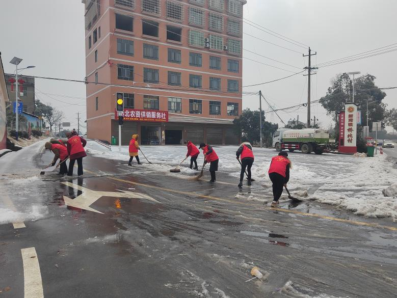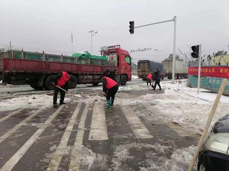 (橋北片區(qū)人大代表文輝、廖伯鈞、蒲群玲等帶領(lǐng)志愿者在村主要道路除雪)
