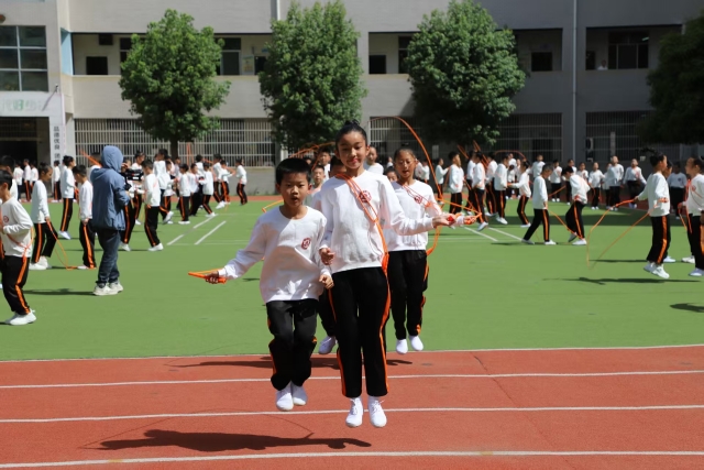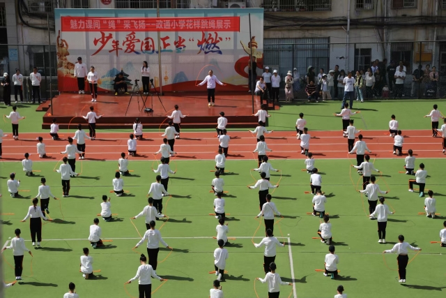 上午10時,政通小學操場上演精彩紛呈的跳繩展演。由1000名學生組成的方陣以《繩舞飛揚》集體繩操開場,整齊劃一的甩繩動作與律動音樂完美契合。一分鐘競速如離弦之箭挑戰極限;花樣跳繩似蝴蝶穿花靈動翩躚;繩操展演若千軍列陣氣勢如虹;彩虹跳繩猶天女散花絢爛蒼穹。師生一同躍動,演繹著教育者與成長者同頻共振的溫情畫面。