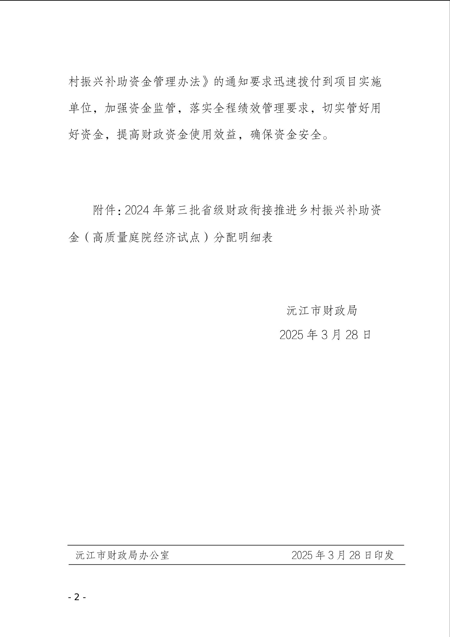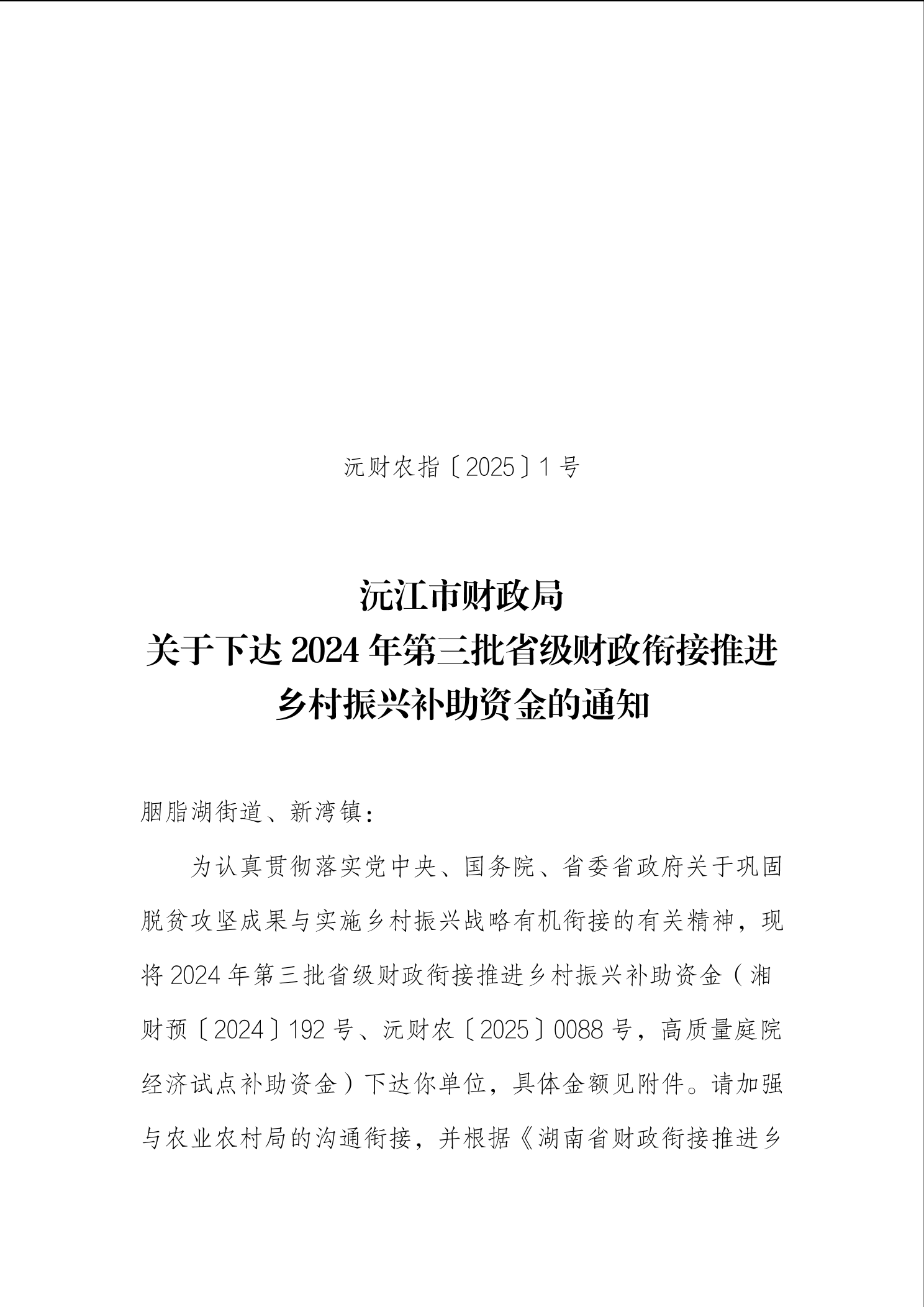 沅財農(nóng)指 [2025] 1號 沅江市財政局關(guān)于下達2024年第三批省級財政銜接推進鄉(xiāng)村振興補助資金的通知