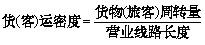 貨(客)運密度 指在一定時期內某種運輸方式在營運線路的某一區段平均每公里線路通過的貨物(旅客)運輸周轉量。計算公式為: