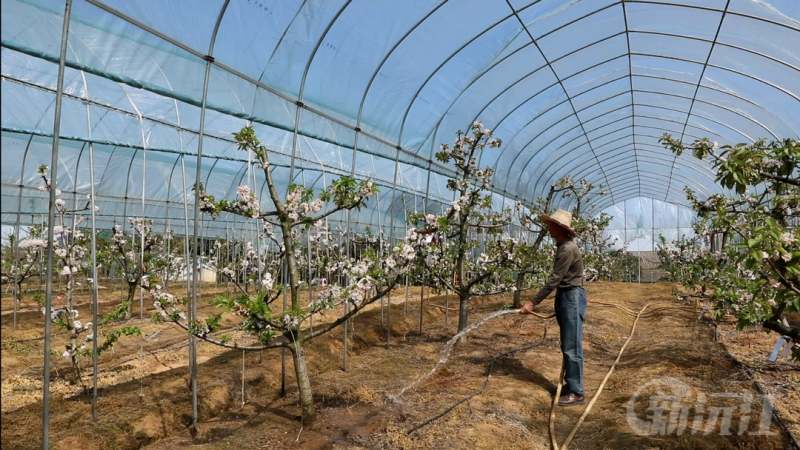 在九只樹村永揚農業有限公司的車厘子種植基地,潔白的車厘子花一朵朵簇擁在一起,像一朵朵白云,飄浮于車厘子樹枝上,在陽光下閃耀著光芒。公司聘用的農婦手持著噴壺,趁著當下的好天氣,為車厘子花進行人工授粉。潔白的車厘子花一經授粉,花瓣上就染上了點點紅色。