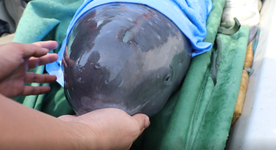 獲救的江豚被轉移到另一艘鋪設了輕柔的海綿墊的沖鋒舟上,醫療組立即注射鎮靜劑,使用35℃恒溫生理鹽水沖洗創面,專業水族醫師精細地清除纏繞在尾鰭上的殘線。在沖鋒舟上完成初步救治后,受傷江豚經特制擔架轉入配備緩沖氣囊和水箱的轉運車,由專車護送到湖南省水生野生動物救護工作站(湖南海底世界),工作人員已經為受傷的江豚準備了干凈舒適的恢復場所,只等傷愈后就將放歸大自然。經檢查,此次獲救的江豚長1.3米,體重七十余斤,為成年江豚。