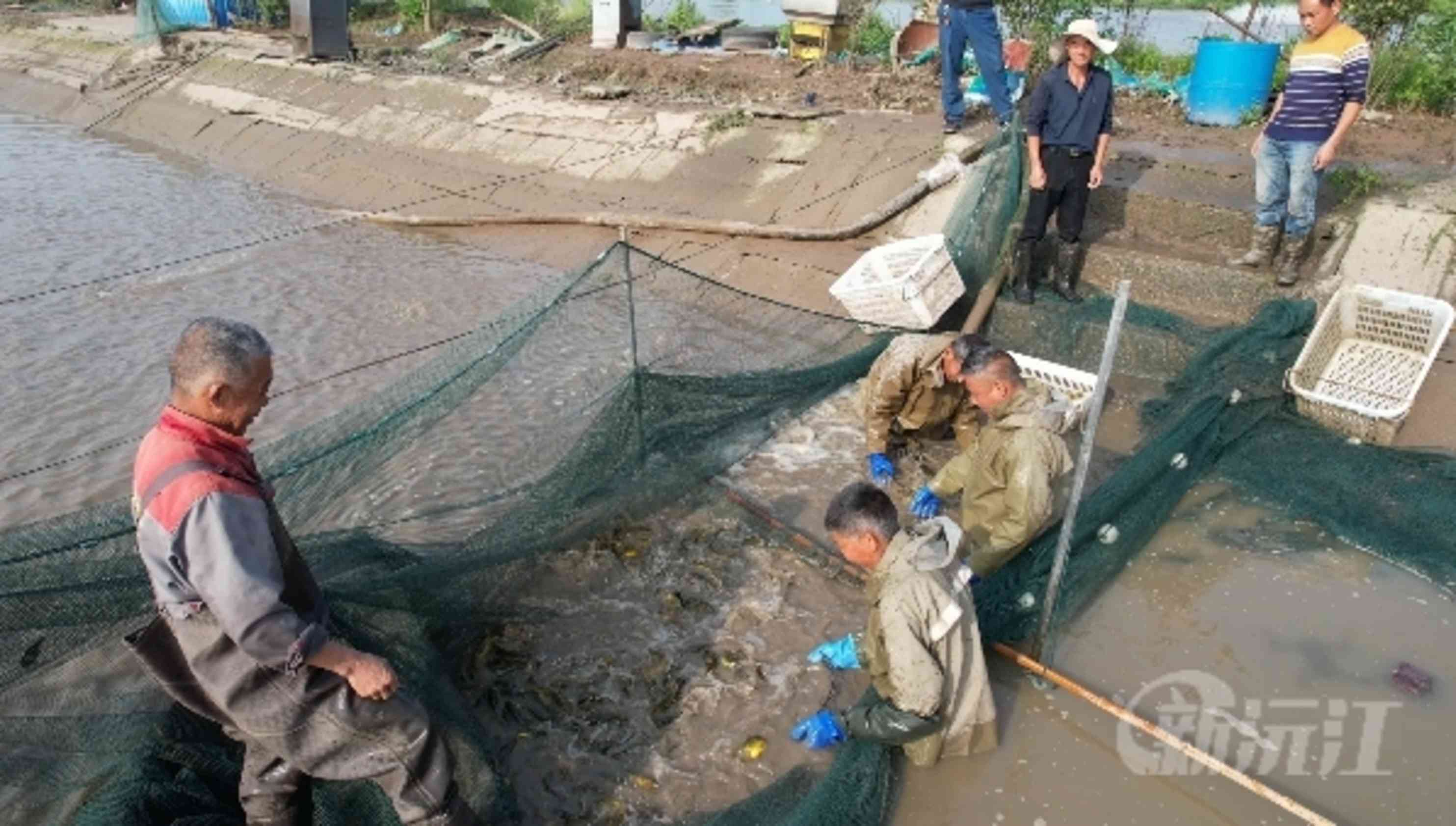 東方剛泛出魚肚白,西良漁場居民唐近秋的魚塘已經熱鬧起來,8名穿著下水褲的工人站在水中起魚。工人下水后將一張大網鋪在水中,然后慢慢將網收攏,入網的魚在水中就開始撲騰,還會不斷躍出水面。看到這樣豐收的場景,唐近秋喜笑顏開。唐近秋介紹:“這個魚塘有13畝,一天可以起1萬5千斤魚,價格是3兩的15塊一斤,今年的黃顙魚是近幾十年里價格最高的一年。”