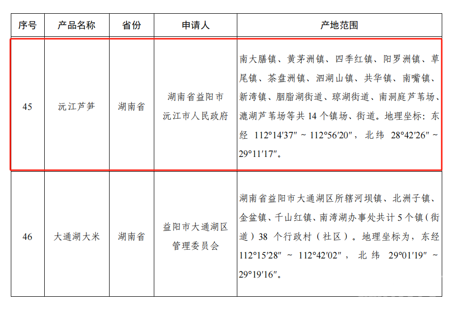 公告標明“沅江蘆筍”的產地范圍為南大膳鎮、黃茅洲鎮、四季紅鎮、陽羅洲鎮、草尾鎮、茶盤洲鎮、泗湖山鎮、共華鎮、南嘴鎮、新灣鎮、胭脂湖街道、瓊湖街道、南洞庭濕地保護和發展事務中心、漉湖濕地保護和發展事務中心等共14個鎮、中心、街道。地理坐標為東經112°14′37″~112°56′20″,北緯28°42′26″~29°11′17″。
