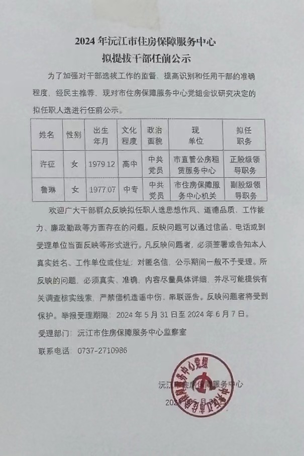 2024年沅江市住房保障服務中心擬提拔干部任期公示