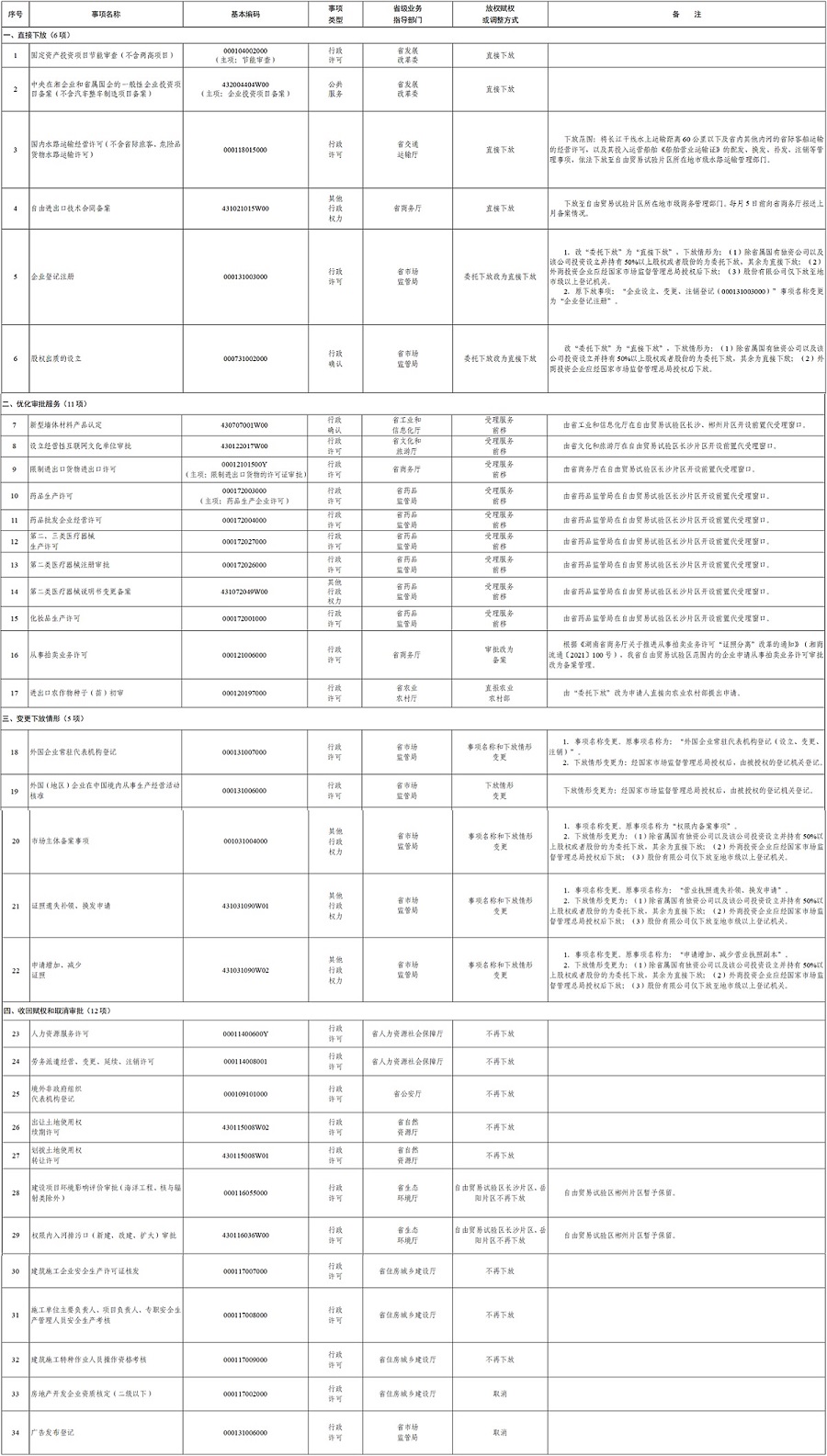 為持續(xù)推進中國(湖南)自由貿易試驗區(qū)放權賦能、精準賦權,進一步推動自由貿易試驗區(qū)高標準高質量建設,經(jīng)研究,省人民政府決定調整一批中國(湖南)自由貿易試驗區(qū)省級賦權事項,其中直接下放6項、優(yōu)化審批服務11項、變更下放情形5項、收回賦權和取消審批12項。