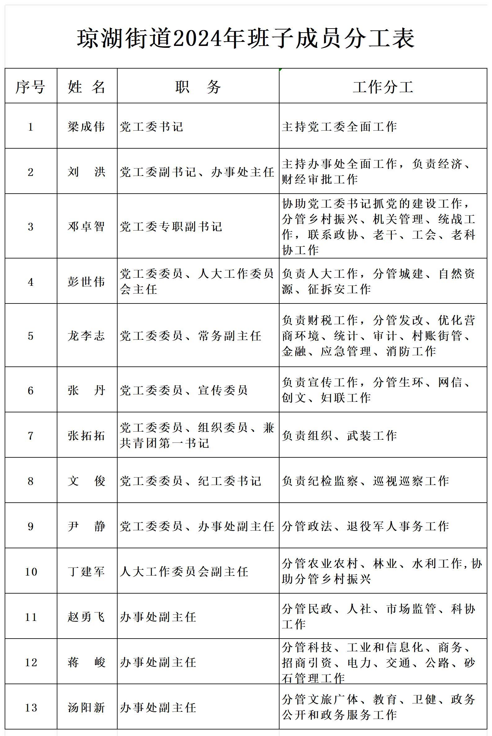 瓊湖街道辦事處班子成員分工表(2024.2)