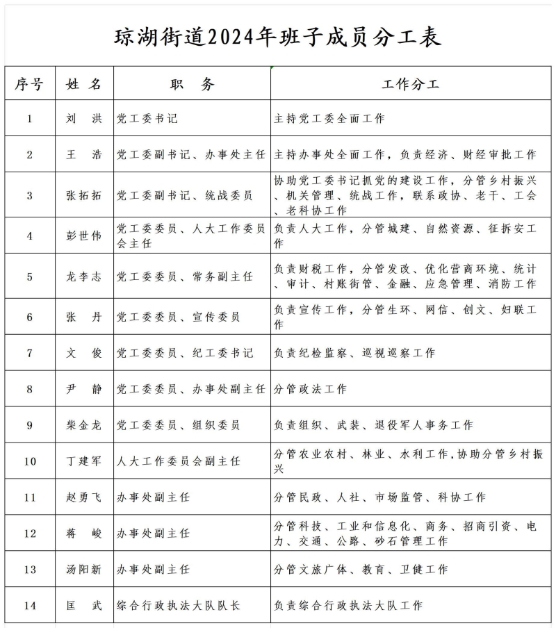 瓊湖街道辦事處班子成員分工表(2024.10)