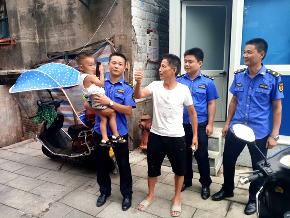 8月21日,沅江市城管局城管大隊一中隊隊員們在巡查過程中幫助一名走失的小男孩找到了家人。