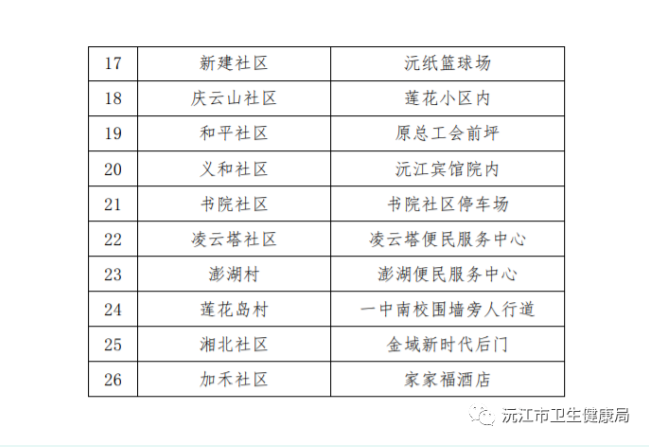 具體采樣點(diǎn)詳見附件《沅江市瓊湖街道中心城區(qū)全員免費(fèi)新冠病毒核酸檢測(cè)采樣點(diǎn)設(shè)置表》,請(qǐng)轄區(qū)內(nèi)居民按社區(qū)通知到指定地點(diǎn)采樣。