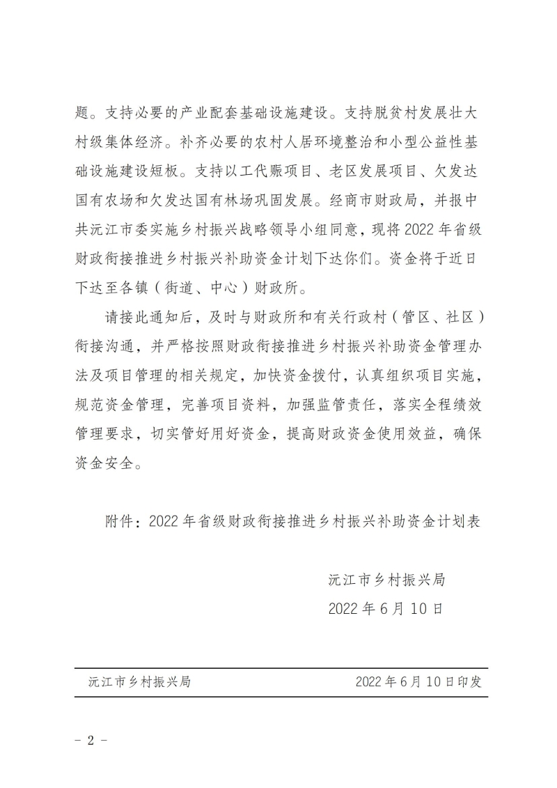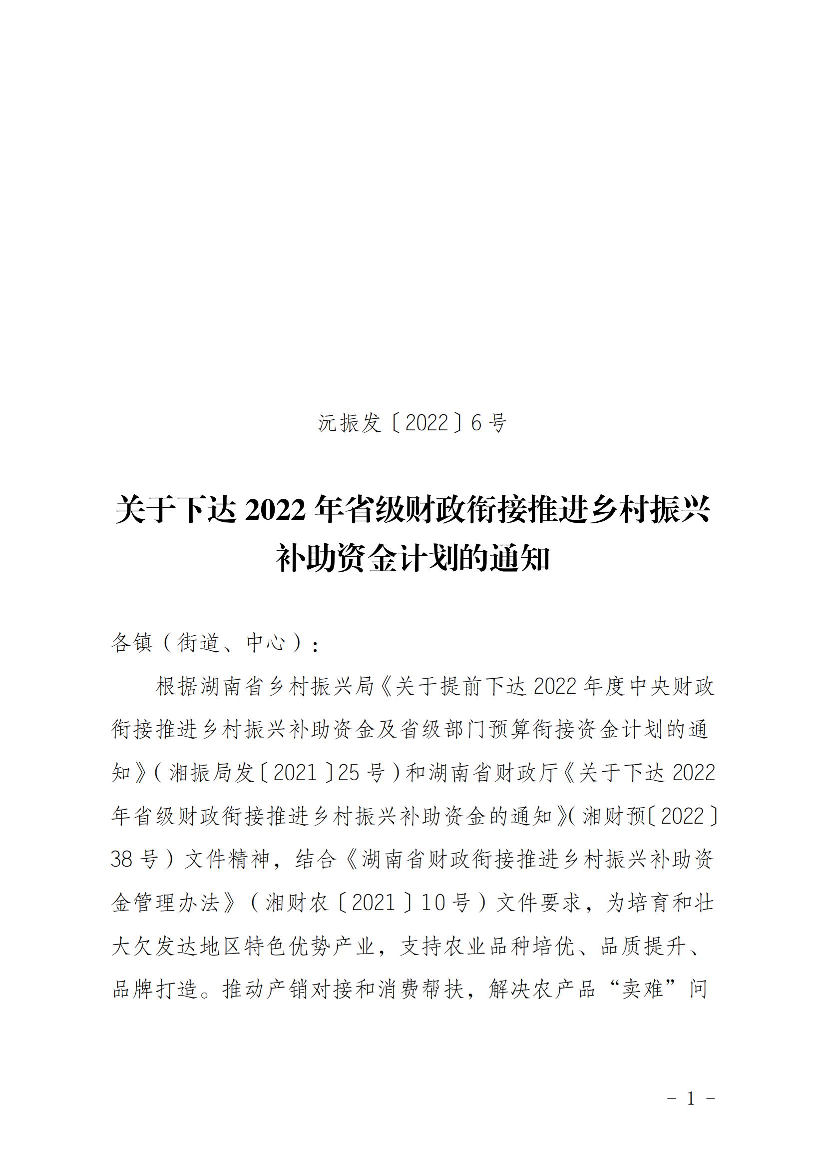 沅振發〔2022〕6號關于下達2022年省級財政銜接推進鄉村振興補助資金計劃的通知