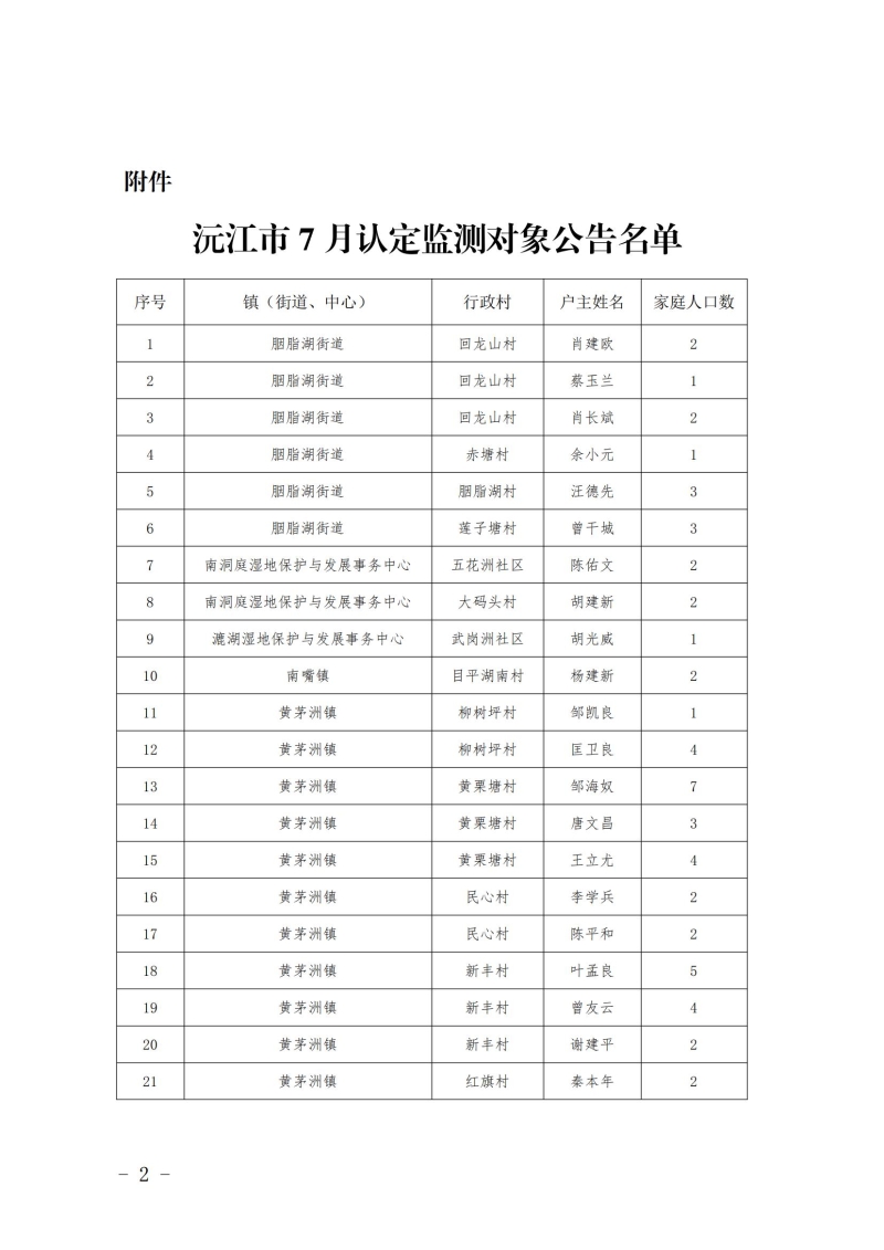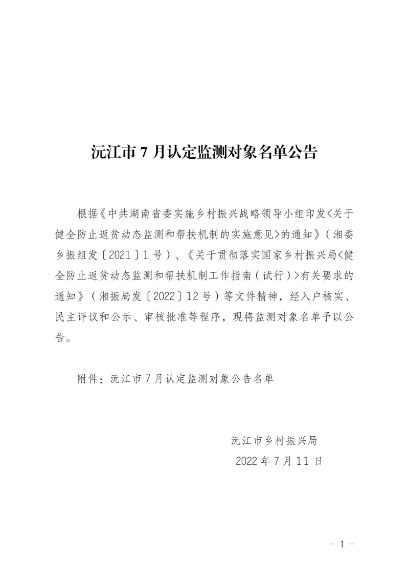 沅江市7月認定監測對象名單公告