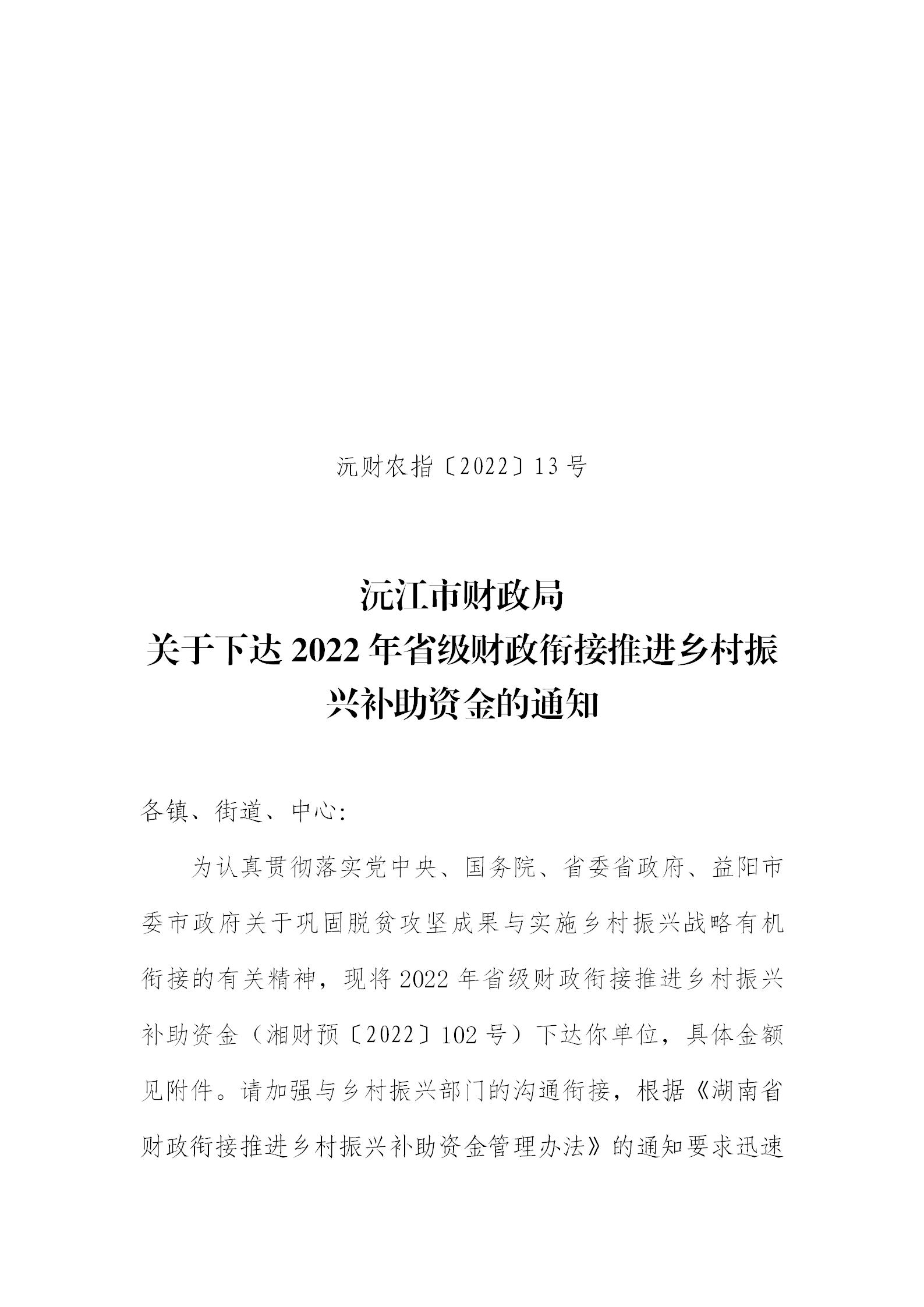 沅財農指〔2022〕13號 沅江市財政局關于下達2022年省級財政銜接推進鄉村振興補助資金的通知