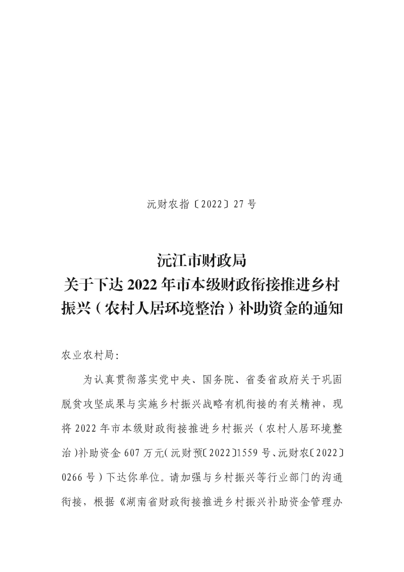沅財農指〔2022〕27號 關于下達2022年市本級財政銜接推進鄉村振興(農村人居環境整治)補助資金的通知