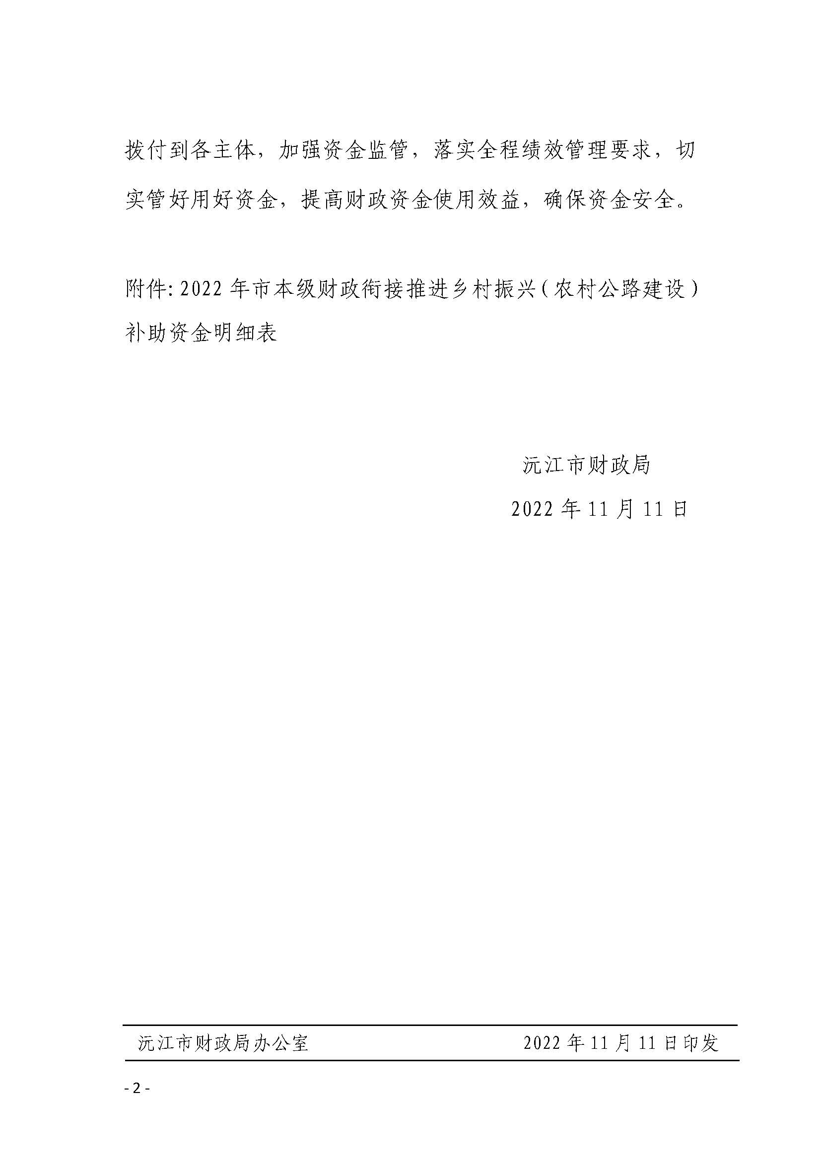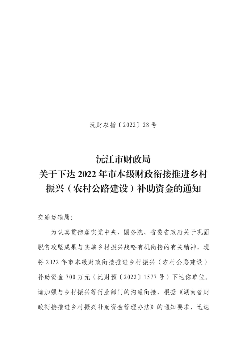沅財(cái)農(nóng)指〔2022〕28號(hào) 關(guān)于下達(dá)2022年市本級(jí)財(cái)政銜接推進(jìn)鄉(xiāng)村振興(農(nóng)村公路建設(shè))補(bǔ)助資金的通知