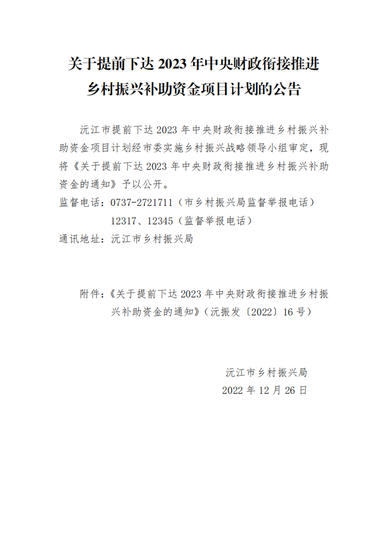 關于提前下達2023年中央財政銜接推進鄉村振興補助資金項目計劃的公告