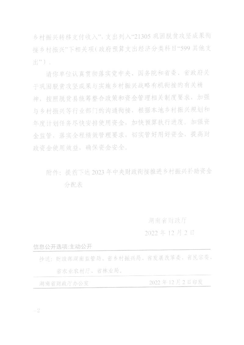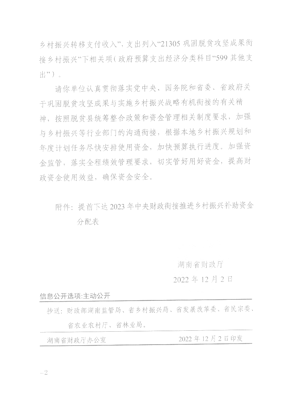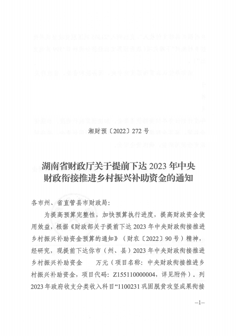 湘財預〔2022〕272號關于提前下達2023年中央財政銜接推進鄉村振興補助資金的通知
