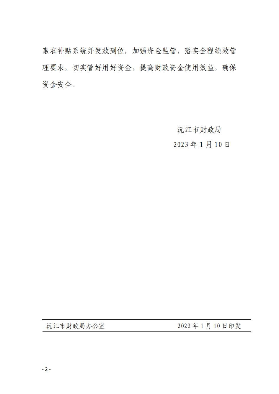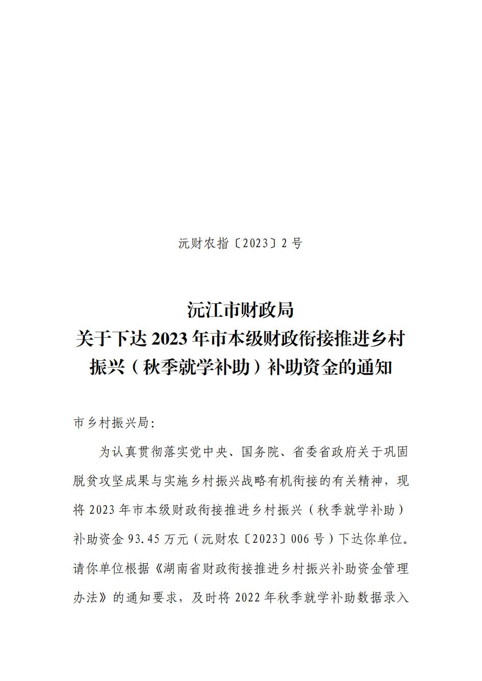沅財農指〔2023〕2號 關于下達2023年市本級財政銜接推進鄉村振興(秋季就學補助)補助資金的通知