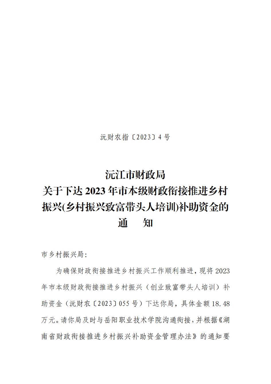沅財(cái)農(nóng)指〔2023〕4號 關(guān)于下達(dá)2023年市本級財(cái)政銜接推進(jìn)鄉(xiāng)村振興(鄉(xiāng)村振興致富帶頭人培訓(xùn))補(bǔ)助資金的通知
