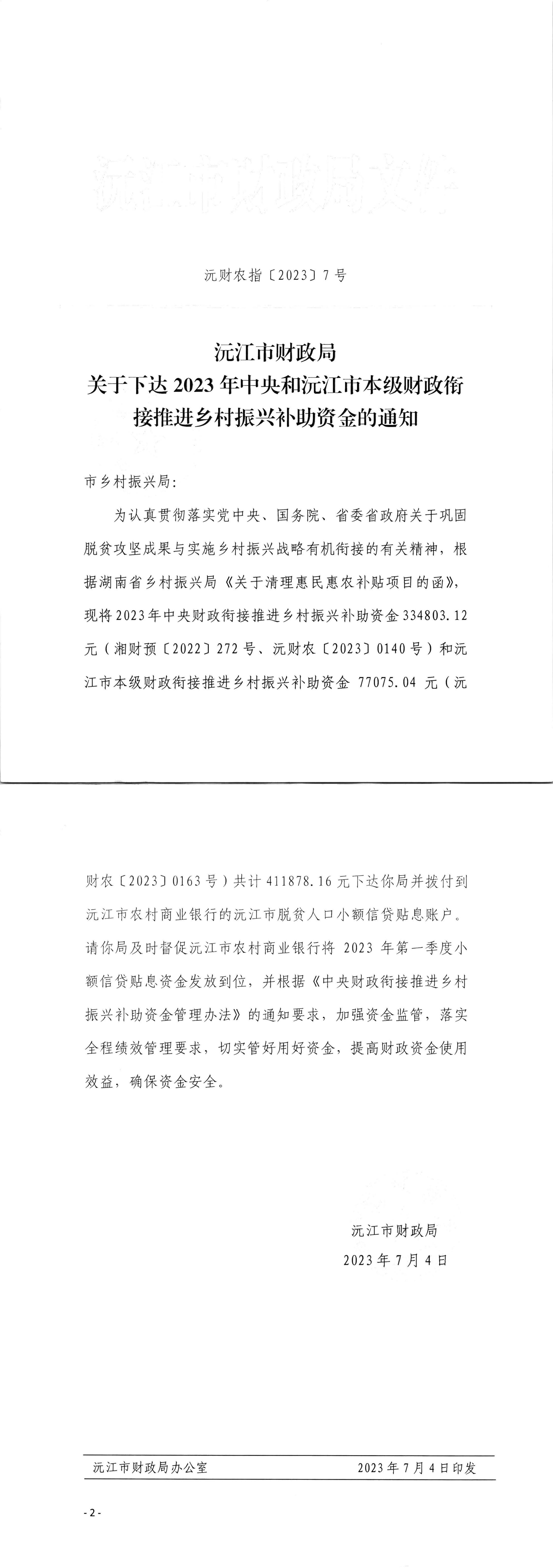 沅財農指〔2023〕7號關于下達2023年中央和沅江市本級財政銜接推進鄉村振興補助資金的通知