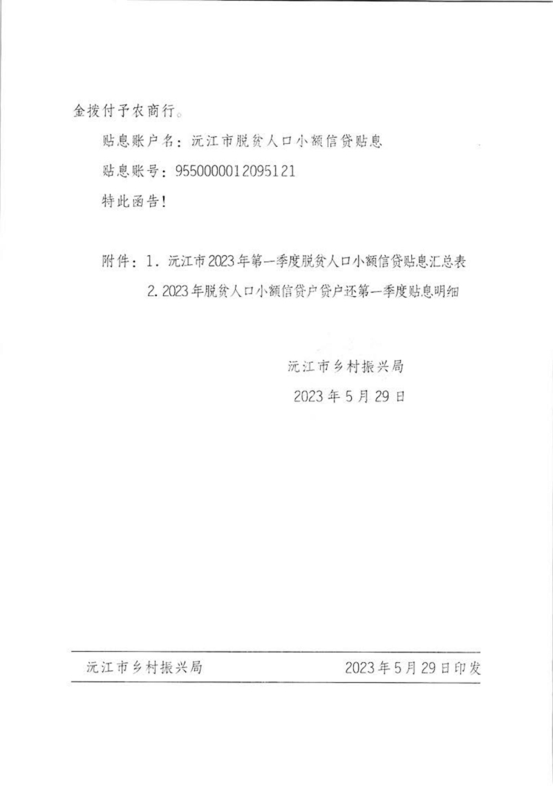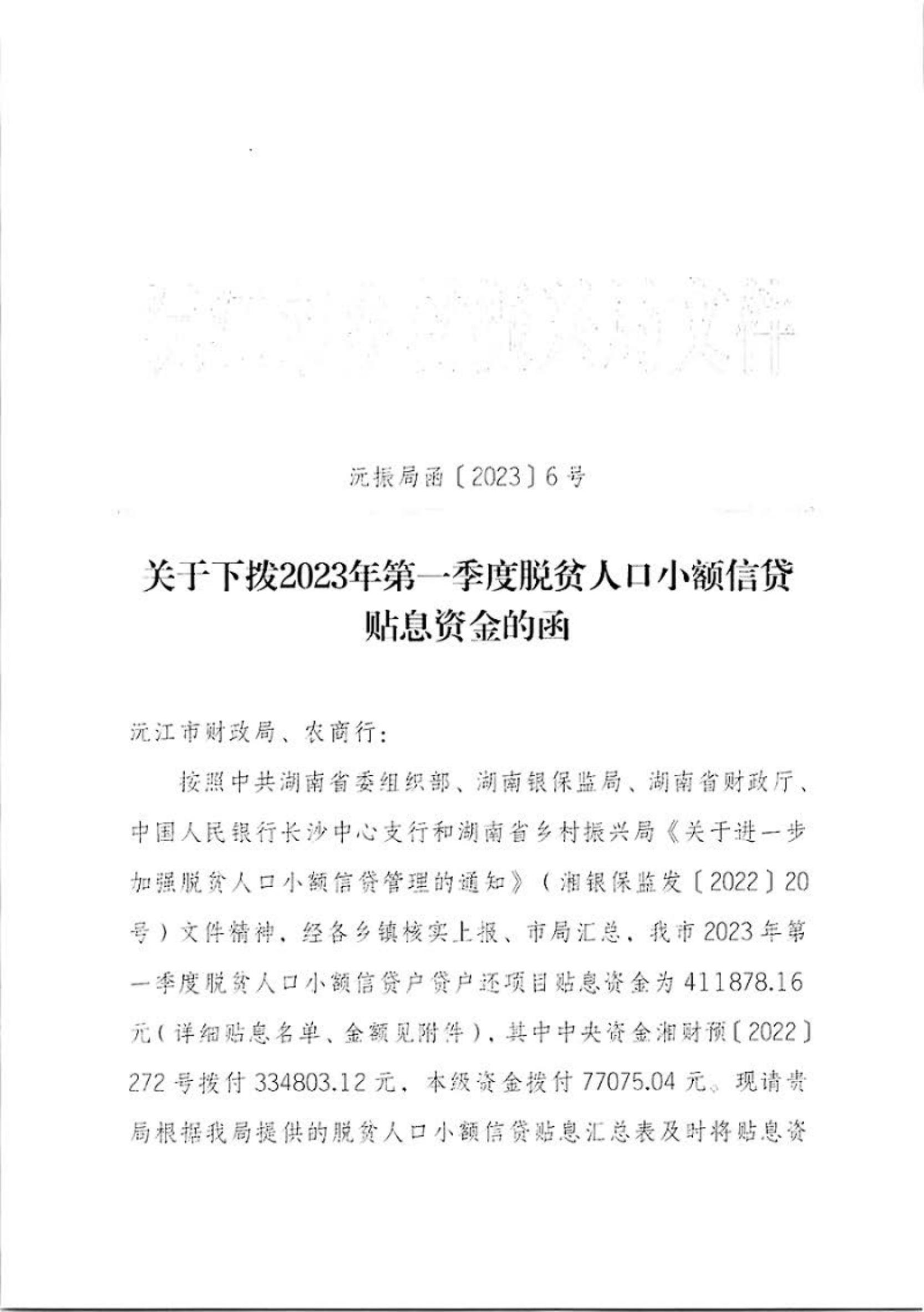 關于下撥2023年第一季度脫貧人口小額信貸 貼息資金的函