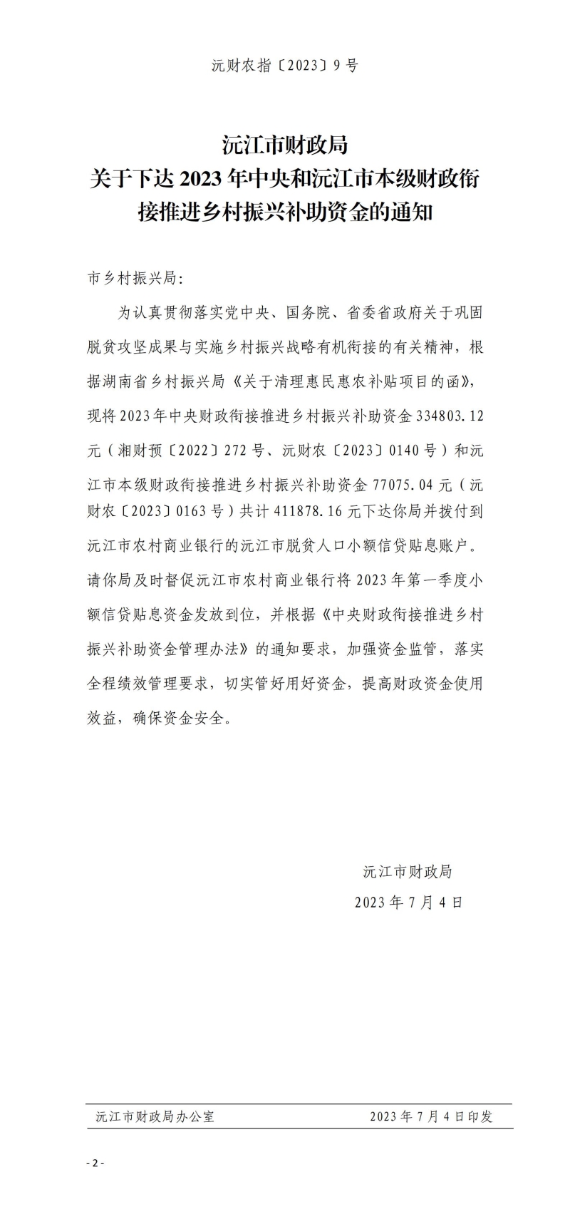 沅財農(nóng)指〔2023〕9號關(guān)于下達2023年中央和沅江市本級財政銜接推進鄉(xiāng)村振興補助資金的通知