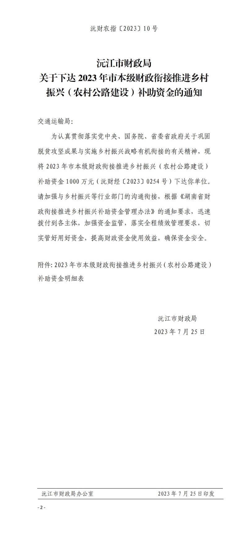 沅財農(nóng)指〔2023〕10號關(guān)于下達2023年市本級財政銜接推進鄉(xiāng)村振興(農(nóng)村公路建設(shè))補助資金的通知