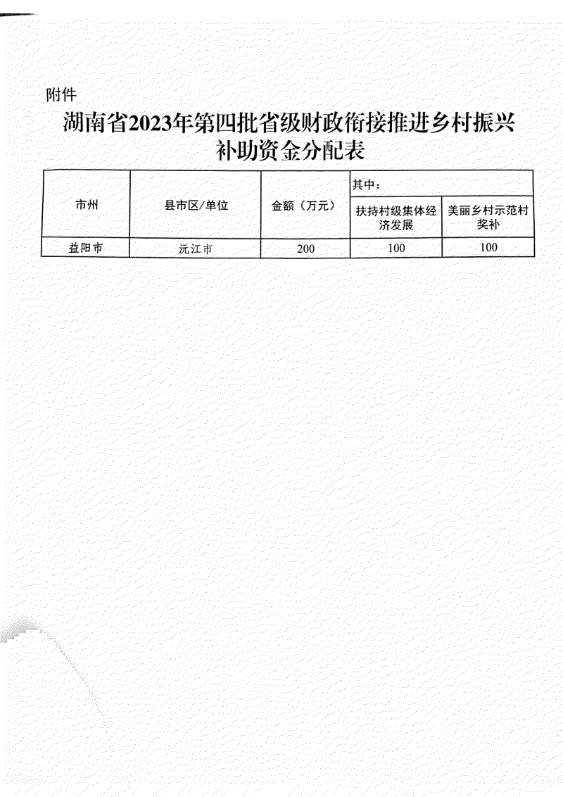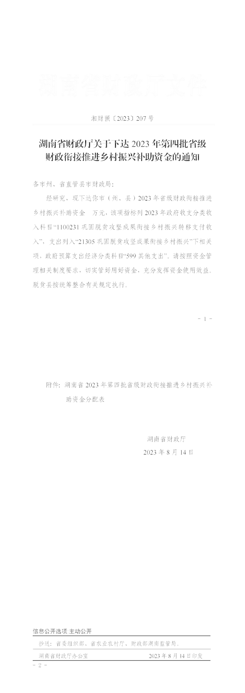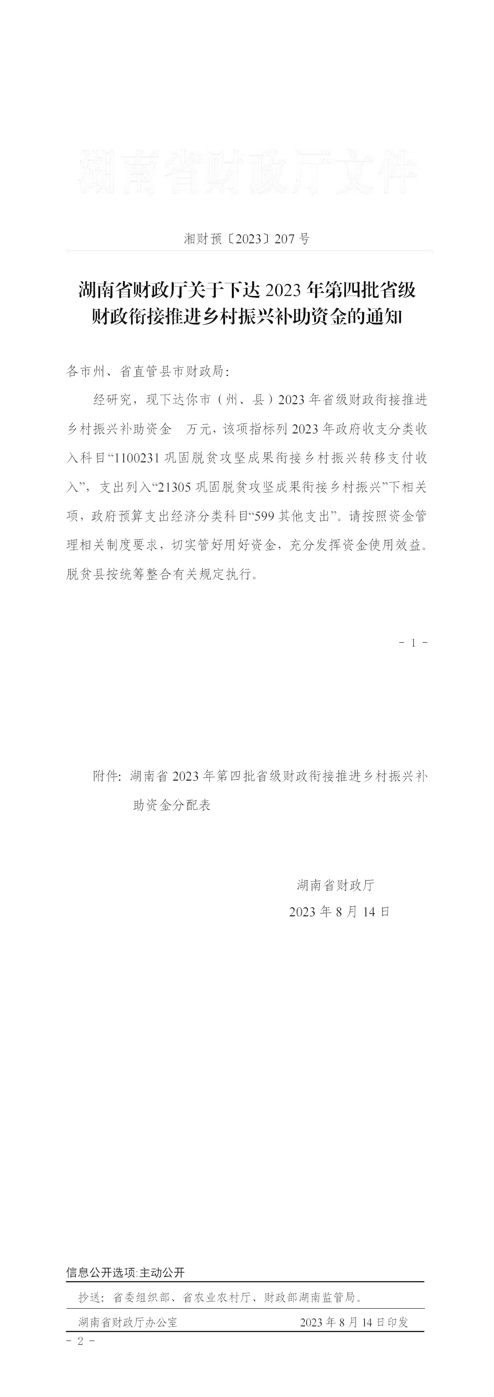 湘財(cái)預(yù)(2023)207號(hào)關(guān)于下達(dá)2023年第四批省級(jí)財(cái)政銜接推進(jìn)鄉(xiāng)村振興補(bǔ)助資金的通知