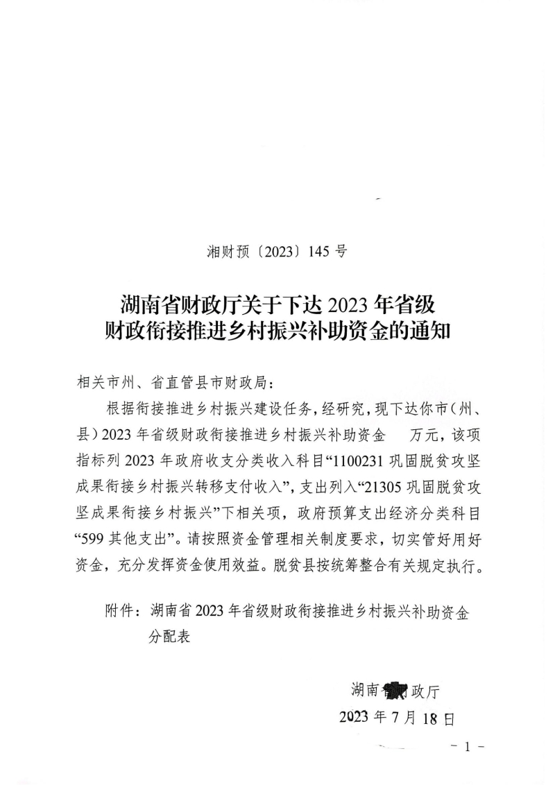 湘財預〔2023〕145號關于下達2023年省級財政銜接推進鄉村振興補助資金的通知