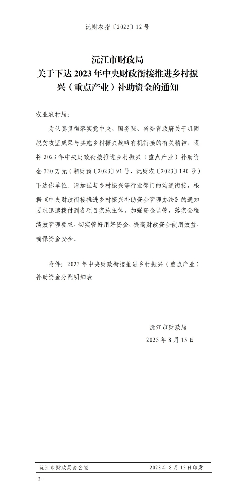 沅財(cái)農(nóng)指〔2023〕12號(hào) 沅江市財(cái)政局 關(guān)于下達(dá)2023年中央財(cái)政銜接推進(jìn)鄉(xiāng)村振興(重點(diǎn)產(chǎn)業(yè))補(bǔ)助資金的通知