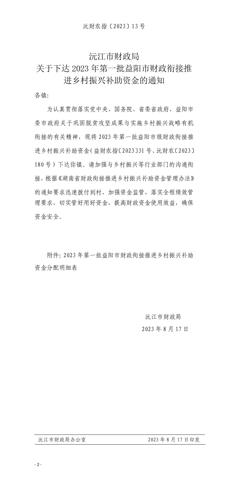 沅財農指〔2023〕13號 沅江市財政局 關于下達2023年第一批益陽市財政銜接推進鄉村振興補助資金的通知