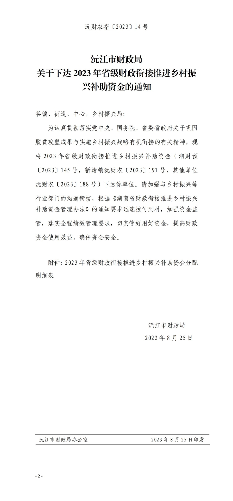 沅財(cái)農(nóng)指〔2023〕14號(hào) 沅江市財(cái)政局 關(guān)于下達(dá)2023年省級(jí)財(cái)政銜接推進(jìn)鄉(xiāng)村振興補(bǔ)助資金的通知
