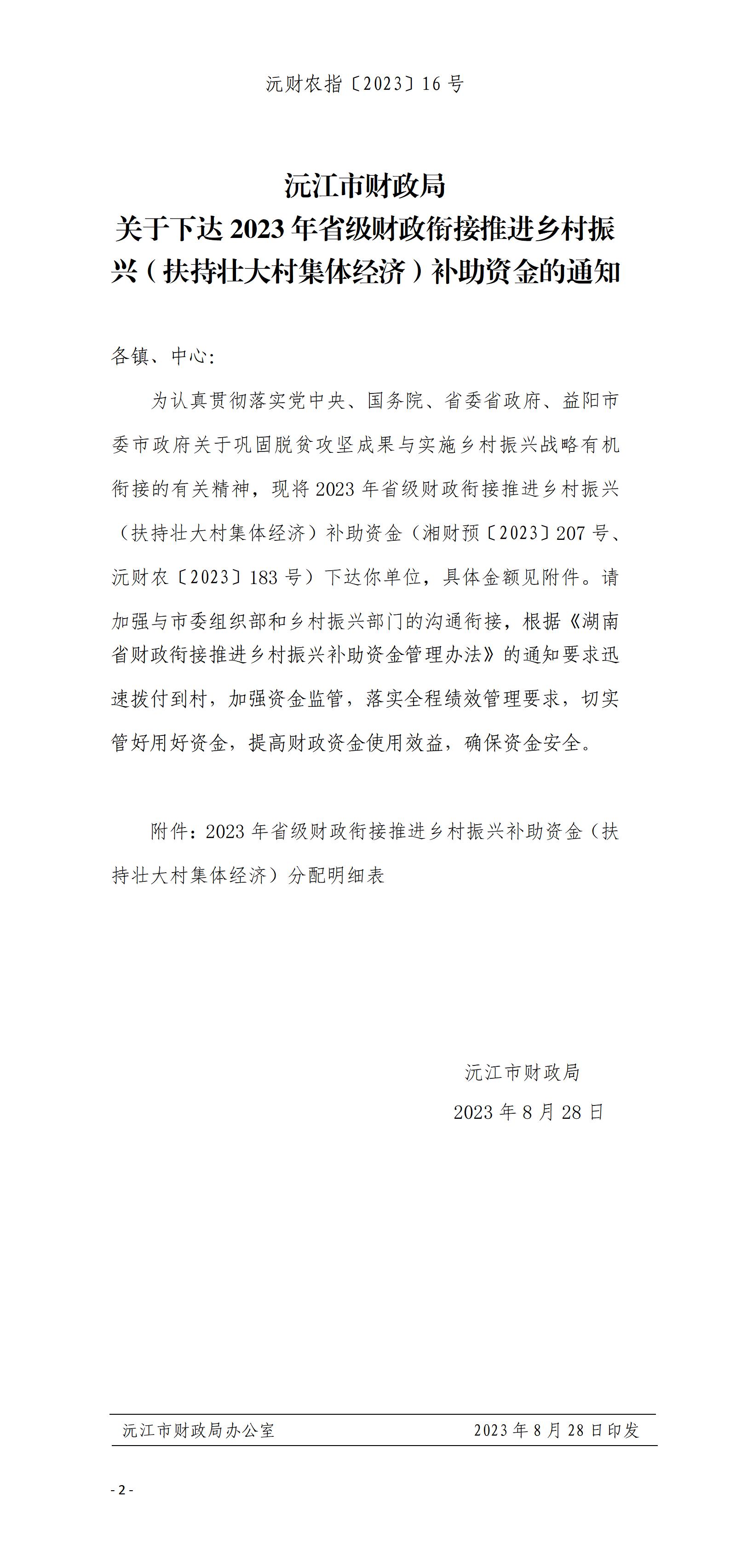 沅財農指〔2023〕16號 沅江市財政局 關于下達2023年省級財政銜接推進鄉村振興(扶持壯大村集體經濟)補助資金的通知