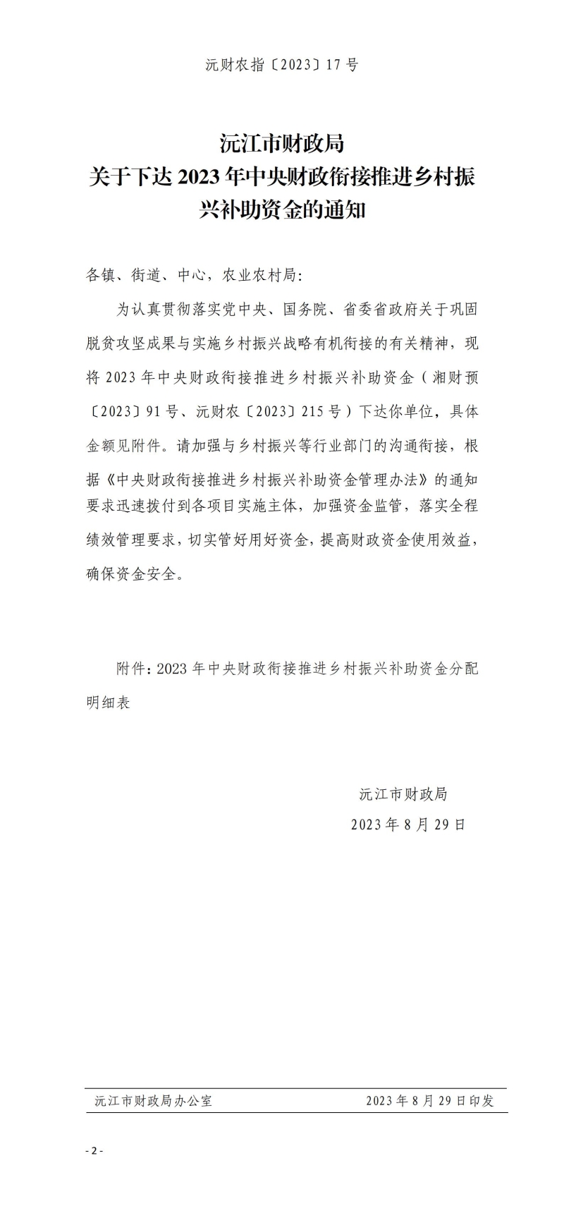 沅財農指〔2023〕17號 沅江市財政局 關于下達2023年中央財政銜接推進鄉村振興補助資金的通知