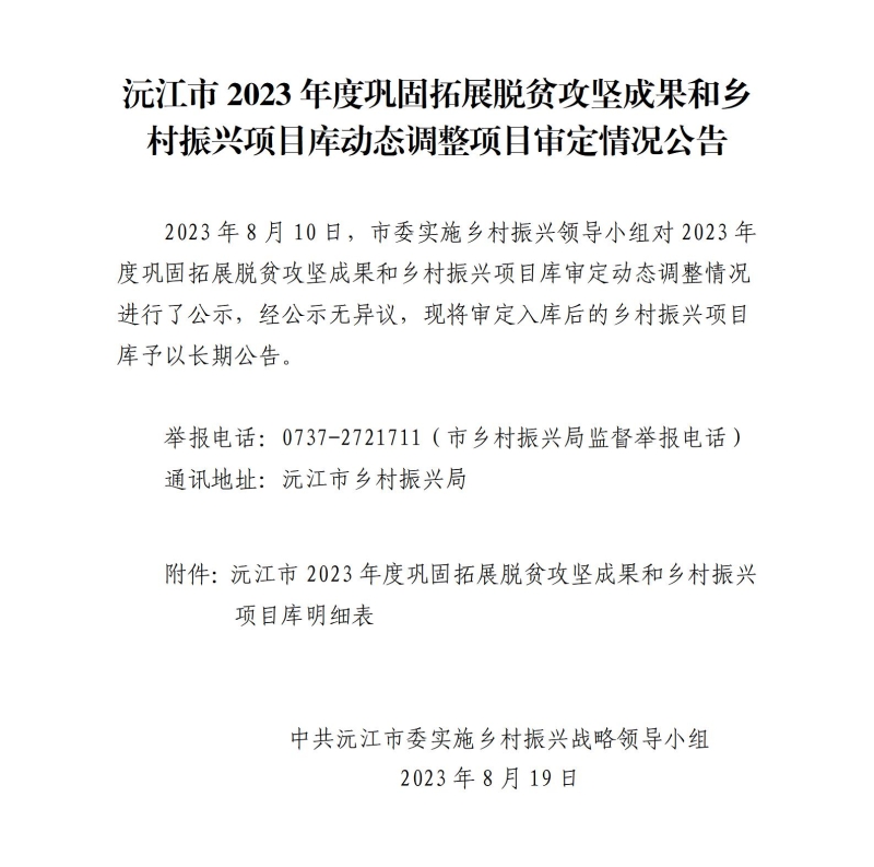 沅江市2023年度鞏固拓展脫貧攻堅(jiān)成果和鄉(xiāng)村振興項(xiàng)目庫(kù)動(dòng)態(tài)調(diào)整項(xiàng)目審定情況公告
