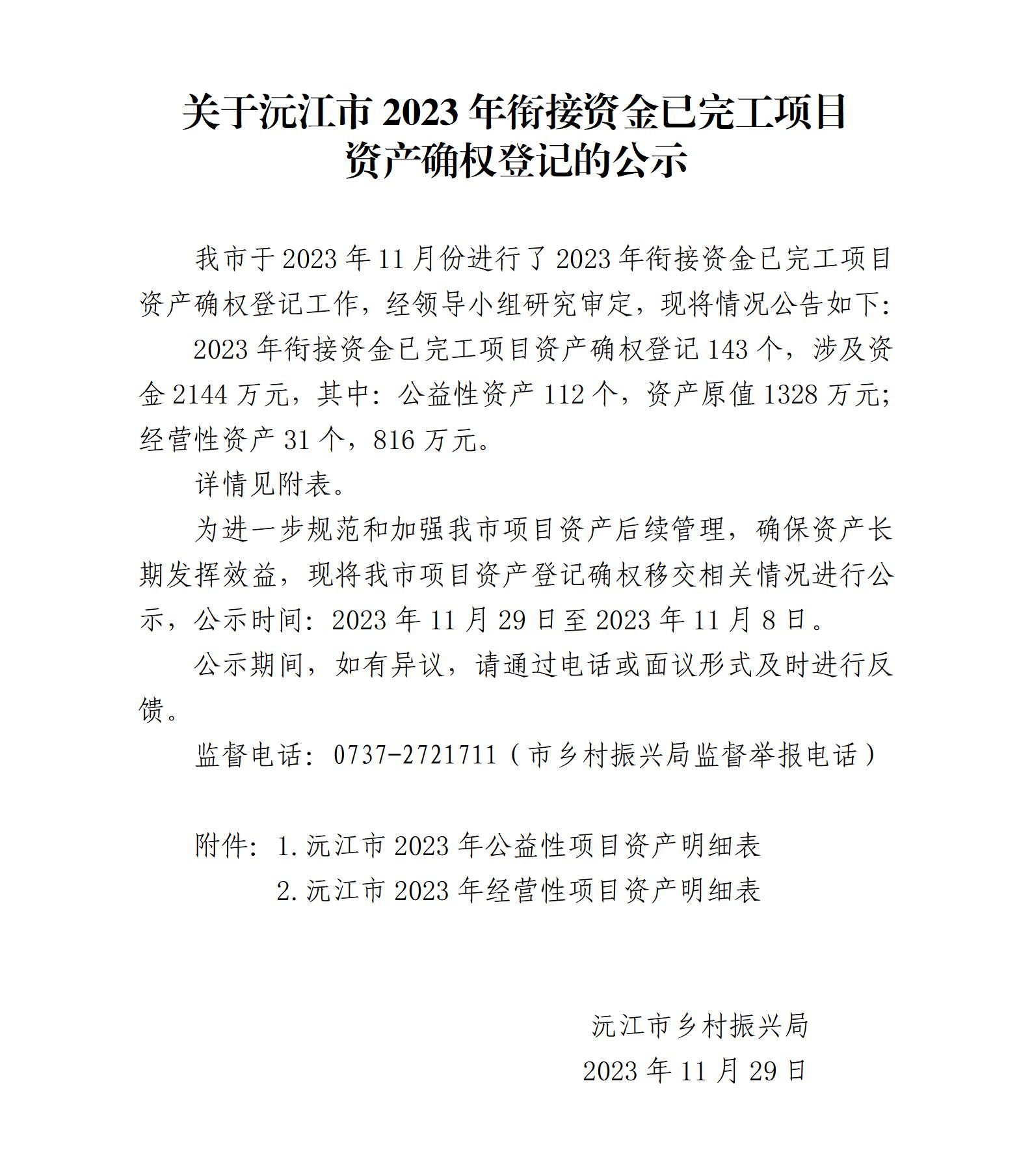 關于沅江市2023年銜接資金已完工項目 資產確權登記的公示