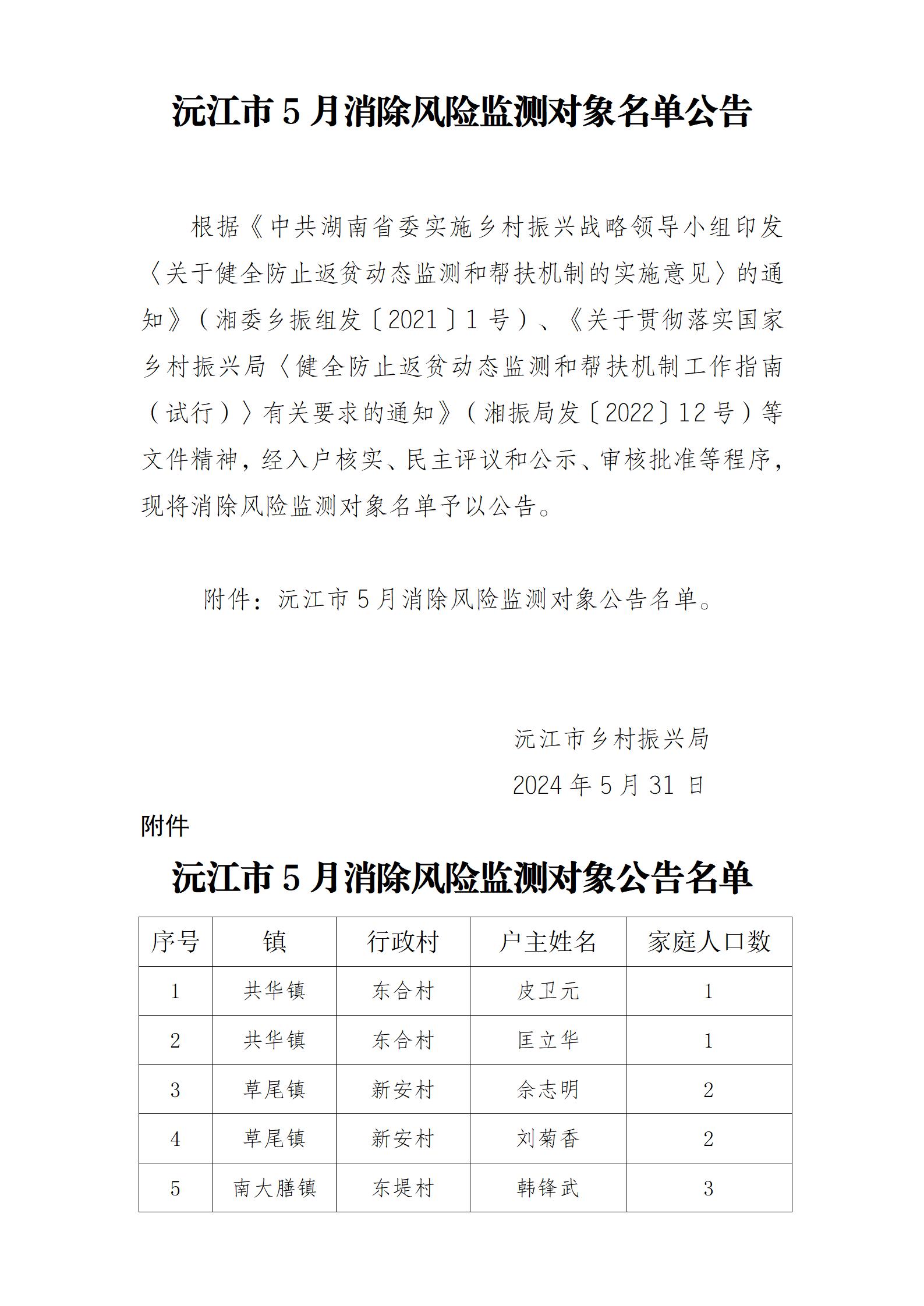沅江市5月消除風險監(jiān)測對象名單公告(第二批)
