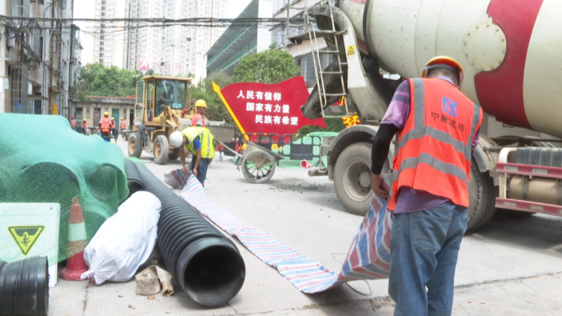 在韓家汊社區老舊小區管網改造施工現場,人頭攢動,機械轟鳴。混凝土運輸車輛在工地內來回穿梭,配合工人將一斗斗混凝土運輸到指定地點。數10名工人正頂著炎炎烈日,硬化小區道路,推動機械夯實混凝土。