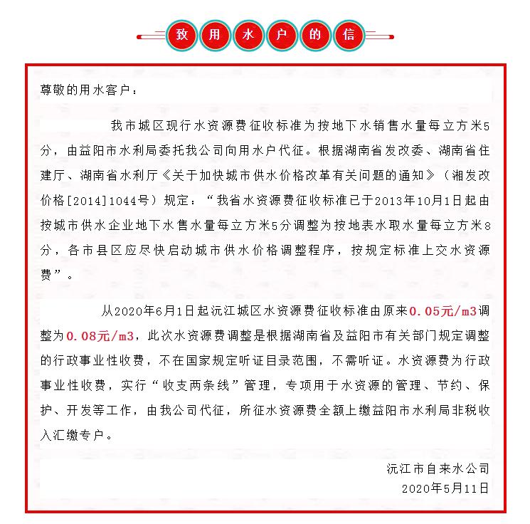 沅江市自來水公司關于調整水資源費代征標準的通知